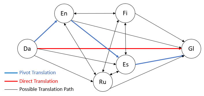 我们考虑到两个距离较远的语言能通过多个中转语言链接起来,其中两个相邻的中转语言间的翻译易于两个原始语言的翻译(距离更近或者可用单语数据更多)。如图13所示,距离较远的丹麦语-加利西亚语(Da-Gl,图中红色路径)能拆分成丹麦语-英语(Da-En)、英语-西班牙语(En-Es)、西班牙语-加利西亚语(Es-Gl)三跳无监督翻译路径(图中蓝色路径),拆分后的翻译性能为12.14分,相比直接的丹麦语-加利西亚语翻译(6.56分)有大幅提高。因此,我们在论文中针对远距离语言对提出了无监督中转翻译(Unsupervised Pivot Translation)方法。