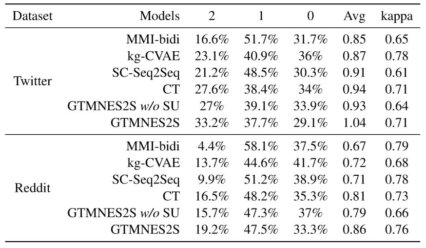 我们在Twitter和Reddit两个数据集上考察了生成回复的相关性、多样性、“一对多“关系建模的准确性、以及meta-word表达的准确性。不仅如此,我们还对生成结果进行了人工评测。实验结果如下: