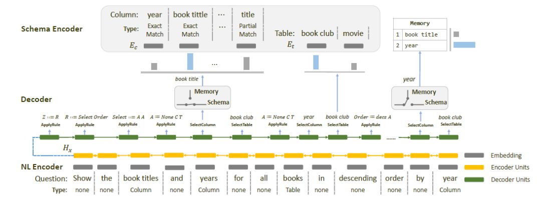 针对这两个挑战,我们提出了IRNet模型。IRNet使用了一个schema linking模块,根据数据库的schema信息,识别自然语言中的提到的表名和列名,建立自然语言和数据库之间的连接。接下来,为了解决面向语义的自然语言和面向执行的SQL查询语句之间不匹配的问题,与以往的Text-to-SQL方法直接生成SQL查询语句不同的是,IRNet首先生成一种中间的语义表示形式SemQL,然后再将中间表示转换成SQL查询语句。