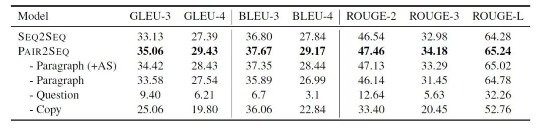 在阅读理解系统中,问题与文档的交互是最为关键的组成部分,受此启发,该论文提出Pair2Seq模型,在编码(encoding)阶段通过注意力机制(attention mechanism)得到问题和文档的加强表示,共同用于解码(decoding)。如表3所示,Pair2Seq模型在多个评价指标上超过Seq2Seq模型。