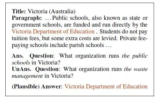 SQuAD 2.0数据集包含5万多个不可答问题,并且为不可答问题标注了一个看起来正确的答案(plausible answer)。图3展示了SQuAD 2.0中一个文档和相应的可答与不可答问题,可以看到这两个问题的(plausible)答案对应到同一个片段,用词十分相似且答案具有的类型(organization),通过对可答问题进行修改就能得到相应的不可答问题。根据这一观察,我们以被标注的文本片段为支点来构造训练问题生成模型所需的数据。