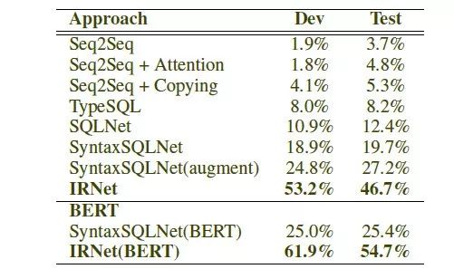实验结果如表10所示,在Spider数据集上,IRNet实现了46.7%的准确率,比已有的最好方法提升了19.5%的准确率。同时,IRNet+Bert实现了54.7%的准确率。