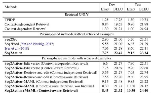 该论文在CONCODE和CSQA两个公开数据集上进行实验,可以看出结合检索和元学习取得了最好的成绩。