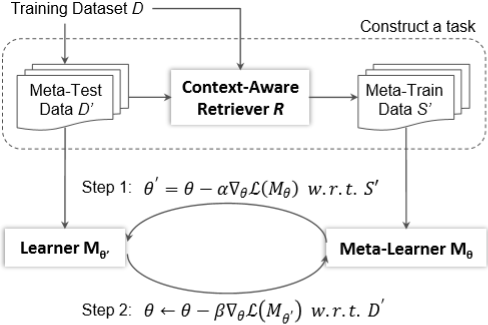 整体框架如图8所示,其中包含了检索和元学习两部分。在检索部分,首先采样一批测试数据D’,然后利用基于上下文的检索模型R找到相似的样例S’作为训练数据,从而构成一个任务。在训练阶段,首先使用训练数据得到特定任务的模型M_(θ^')(step 1),然后再利用测试数据更新元学习器M_θ(step 2)。在预测阶段,先使用相似样本更新元学习器的参数,然后再进行预测。