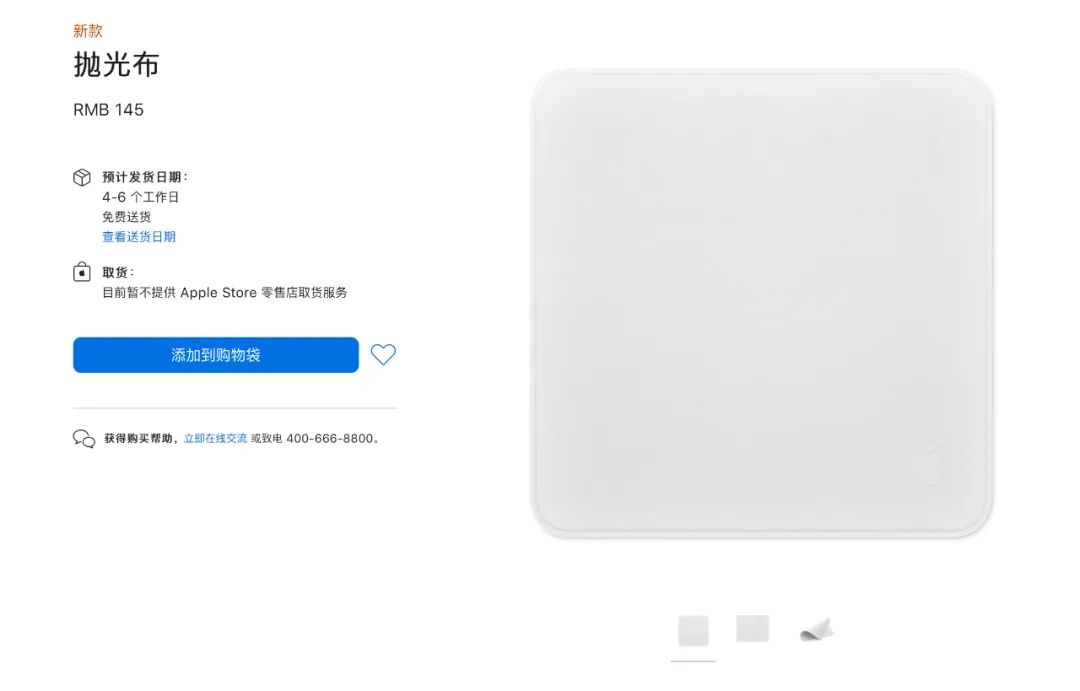 苹果昨天发布了一块超细纤维的抛光布,专为清洁苹果设备的屏幕而设计,售价145元,4-6 个工作日发货。