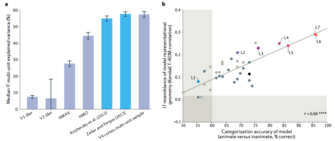 a:反向传播训练的模型(蓝色)比其他模型(灰色)更好地解释了颞下皮质层的多单元反应。b:具有更好分类性能的模型与颞下皮质层表示更为相似。