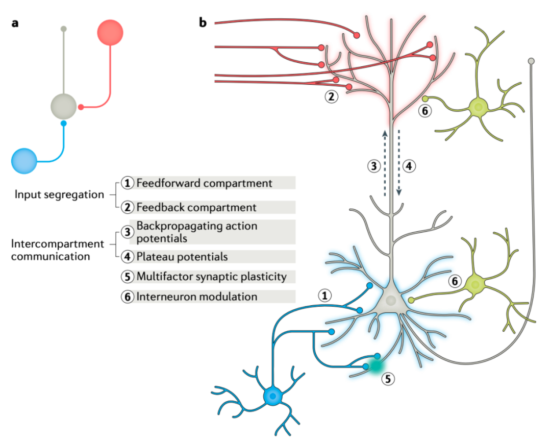 每个区室的可塑性可以取决于自身突触事件和另一区室中触发的事件(5)。例如,顶端产生的平台电位的到来可能会改变“向前”的基础突触可塑性。最后,局部抑制性神经元(黄色细胞)可以调节亚细胞区室之间的通讯,并且自身可以被高阶输入差异性地募集,从而可以调节正向和反向路径之间的相互作用(6)。
