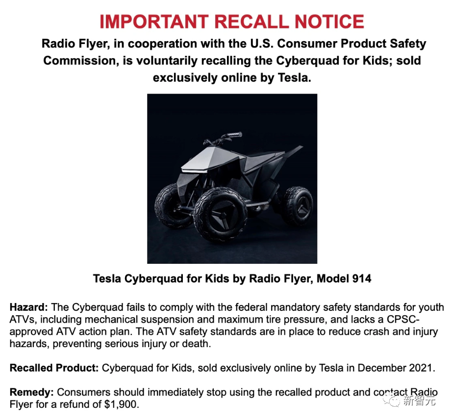 此次召回涉及Radio Flyer的所有特斯拉儿童版Cyberquad,型号为914。