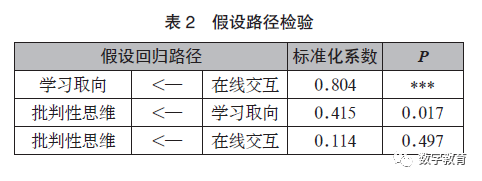 2. 学习取向在在线交互和批判性思维的关系中起到完全中介作用