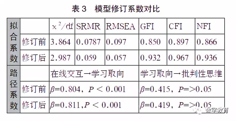 在上述研究的基础上,精简模型,删除在线交互对批判性思维的直接影响路径。再次进行模型拟合度检验(χ2/df=2.987,SRMR=0.059,RMSEA=0.057, GFI=0.932,CFI=0.967,NFI=0.936),在线交互对学习取向的影响依然显著(β=0.811,P < 0.001), 学习取向对批判性思维的正向影响依然显著(β=0.419, P <0.05),模型拟合度更加优秀,回归系数更加显著, 说明本研究模型修订具有一定的合理性,模型修订前后对比如表3所示。修订完成的模型图如图2 所示。