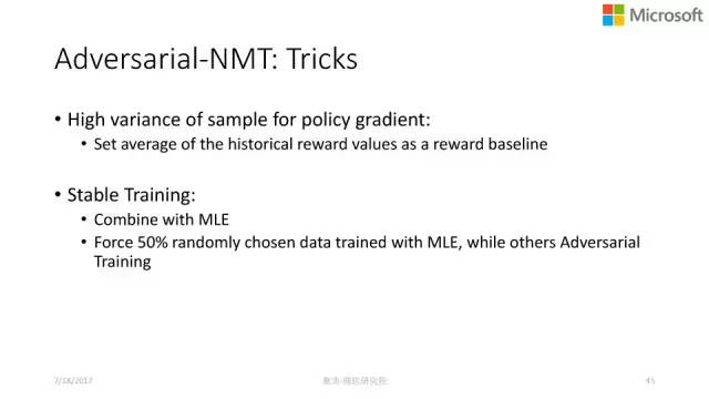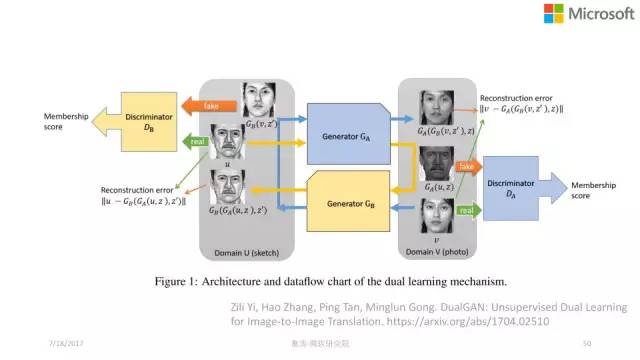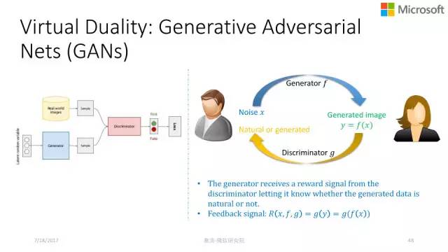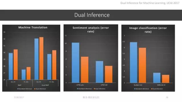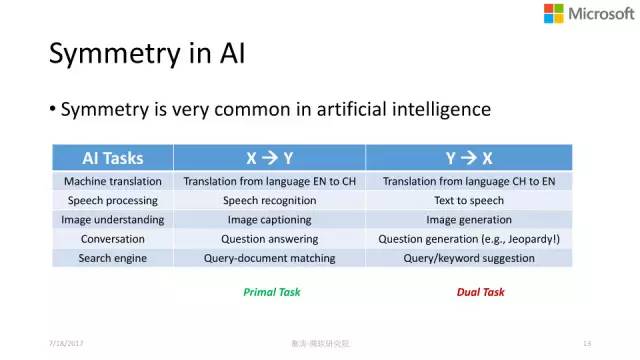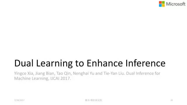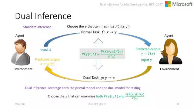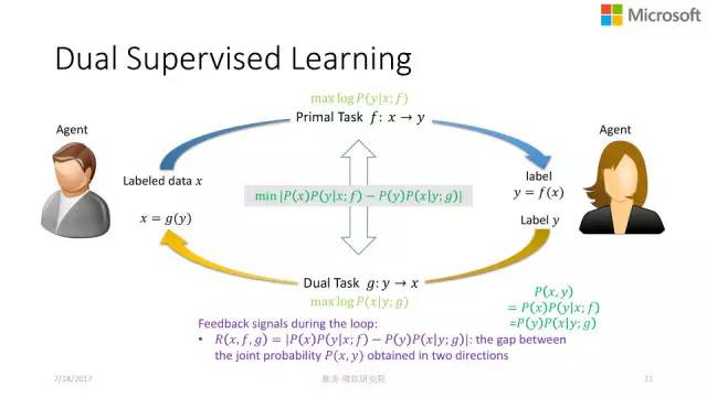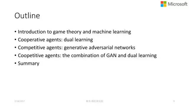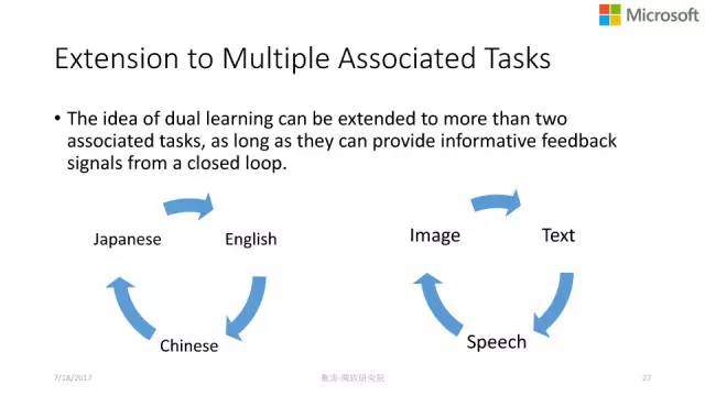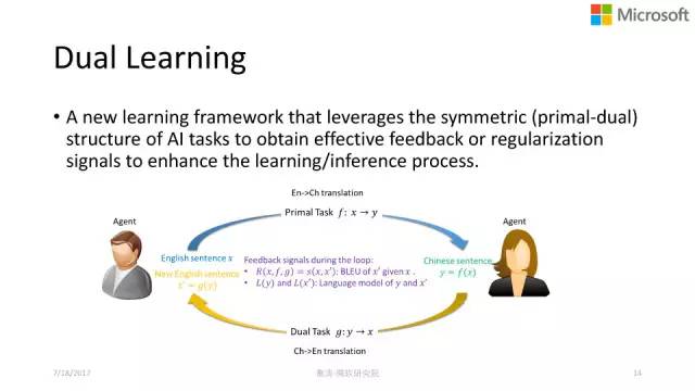 微软亚洲研究院的秦涛主管研究员做了“从单智能体学习到多智能体学习:GAN,对偶学习等”的报告,从协同式多智能体学习、竞争式多智能体学习、协同和竞争共存式多智能体学习三方面,阐述了微软亚洲研究院关于多智能体学习的最新研究,讨论了对偶学习如何提高学习效率,包括从未标记数据中学习(双向无监督学习)、从已标记数据中学习(双向监督学习)和推理(双向推理),并介绍了对抗神经机器翻译的相关工作。