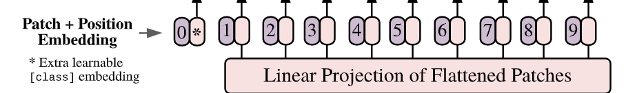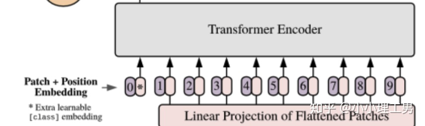 如上图所示1,编号有0-9的紫色框表示各个位置的position embedding,而紫色框旁边的粉色框则是经过linear projection之后的flattened patch向量。文中采用将position embedding(即图中紫色框)和patch embedding(即图中粉色框)相加的方式结合position信息。