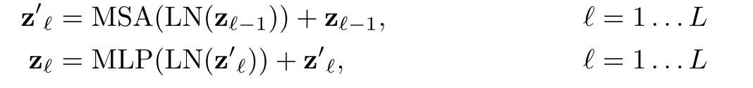 其中MSA为Multi-Head Self-Attention(即Transformer Encoder结构图中的绿色框),MLP为Multi-Layer Perceptron(即Transformer Encoder结构图中的蓝色框),LN为Layer Norm(即Transformer Encoder结构图中的黄色框)。