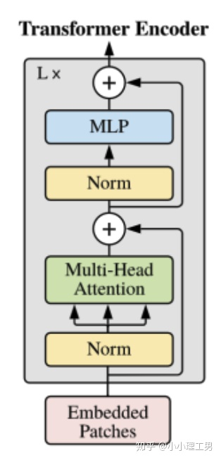 Transformer Encoder结构和NLP中transformer结构基本上相同,所以这里只给出其结构图,和公式化的计算过程,也是顺便用公式表达了之前所说的几个部分内容。