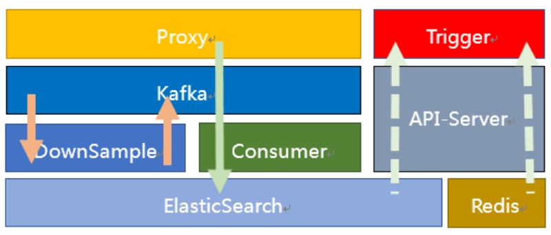 在这个架构中监控数据从 Proxy 进来,经过格式整理、数据补全、限流后发送到 Kafka。Donwsample 消费 Kafka 中的原始数据进行时间维度上的聚合,聚合成 5m、15m 等时间维度的数据点之后写入到 Kafka。Consumer 消费 Kafka 中的原始数据和聚合数据写入到 ES,通过 API-Server 提供统一的接口给看图和告警。