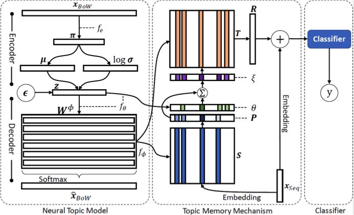 图 1:主题记忆网络的框架图。从左到右分别是神经主题模型、主题记忆机制与文本分类器。