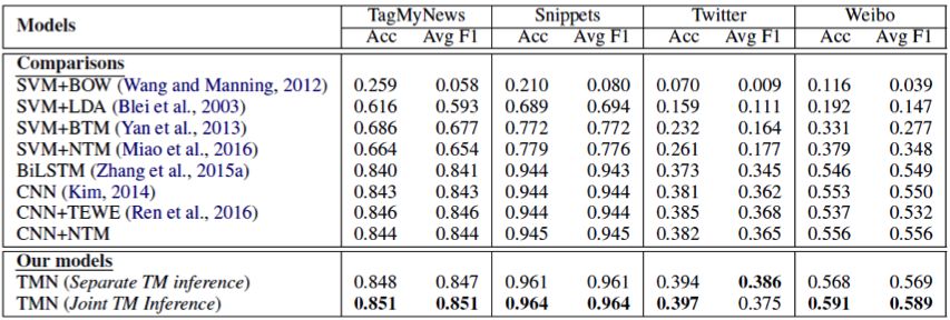 表 3:主题记忆网络与比较模型的实验结果。TMN 表示主题记忆网络:TMN (Separate TM inference) 表示先预训练好神经主题模型,之后把其输出的主题表示初始化主题记忆机制来进行文本分类。TMN (Joint TM inference) 表示神经主题模型与文本分类联合训练。两个版本的主题记忆网络的结果显著高于所有的比较模型(p<0.05 paired t-test)。