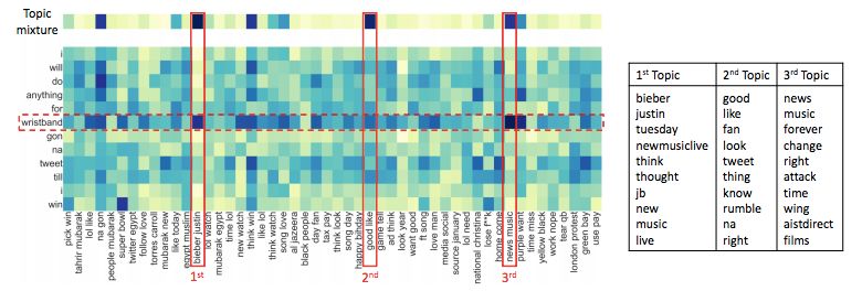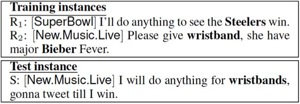 R1 和 R2 都是训练样本分别属于 Super Bowl (超级碗) 以及 New Music Live(新音乐盛典)类别,S 是测试样本属于 New Music Live 类别,但是仅仅从给定的 11 个单词,很难判断出 S 与新音乐盛典的关系。但是 R2 中 wristband(手环)与 Bieber(比伯)的共现极大地丰富了 wristband 的语义,将 wristban\d 与 New Music Live 关联起来,因为当时 Twitter 上支持 Bieber 送手环的活动使得训练语料中 wristband 和 Bieber 在 New Music Live 类别的 tweets 中大量共现。如果模型能够定位到 wristband 是一个关键的词,就更容易判断出测试样本 S 应该被分类为 New Music Live,否则的话,S 很有可能被错误分类为 Super Bowl,因为其与 R1 大部分的词都是重合的。