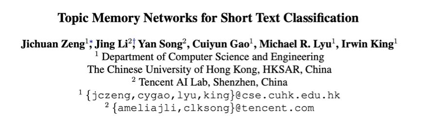 在 EMNLP 2018 中,针对短文本的处理,腾讯 AI Lab 发布了 论文 Topic Memory Networks for Short Text Classification。这篇论文由腾讯 AI Lab 主导,与香港中文大学合作完成。本文是主题模型与文本分类在神经网络框架下的一次结合,作为主题模型与深度学习联合训练的一个早期的探索,能够很自然地被扩展到很多深度学习任务的上。