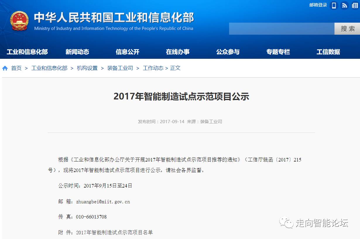近日,工信部官网公示2017年智能制造试点示范项目。以下为公示全文。本文来自:工信微报,由《走向智能论坛》微信公众号推荐阅读。
