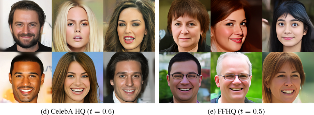 ▲ NVAE 在 CelebA HQ 和 FFHQ 上的生成效果。值得注意的是,NVAE 是第一个 FFHQ 数据集上做实验的 VAE 类模型,而且第一次就如此惊艳了