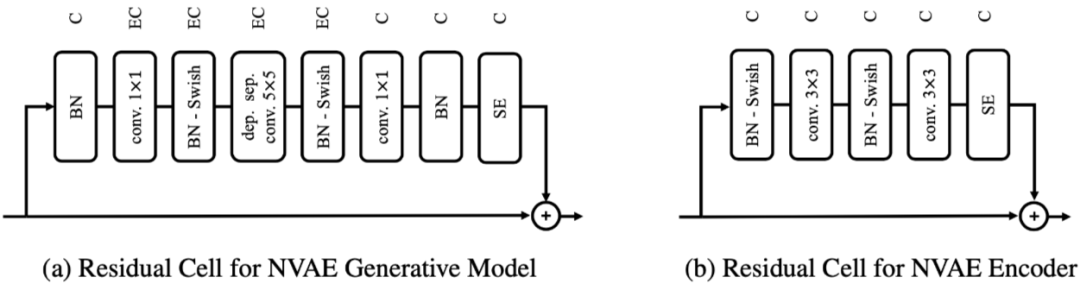 铺垫了这么久,总算能谈到 NVAE 了。NVAE 全称是 Nouveau VAE(难道不是 Nvidia VAE?),它包含了很多当前 CV 领域的新成果,其中包括多尺度架构、可分离卷积、swish 激活函数、flow 模型等,可谓融百家之所长,遂成当前最强 VAE~