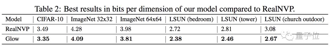 除了肉眼可辨的效果之外,团队还对比了Glow和前辈RealNVP (来自2016年的Dinh实验室) ,处理数据集时的成绩——