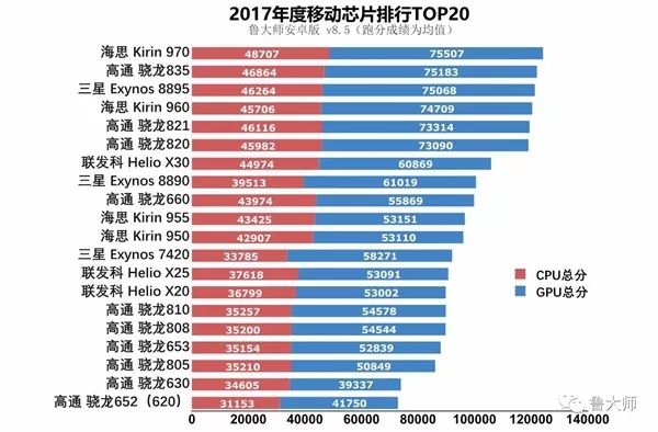 除了手机性能榜,鲁大师近日还公布了2017年度的安卓智能手机芯片排行榜TOP10,华为麒麟970成功压制高通骁龙835拔得头筹。
