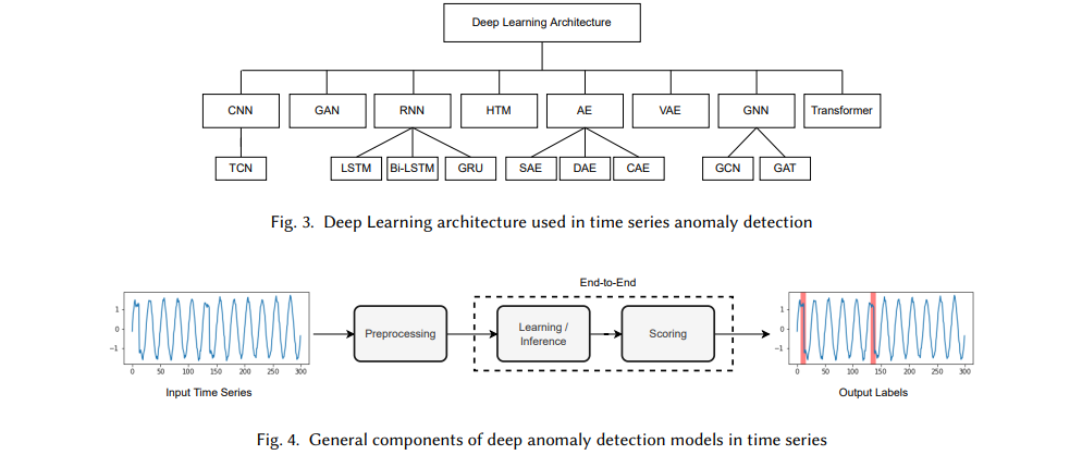 在具有复杂结构的数据中,深度神经网络是建模依赖关系的强大方法。许多学者对其在异常检测中的应用非常着迷,它使用了许多深度学习架构,如图3所示。在实践中,训练数据往往只有极少数被标记的异常。因此,大多数模型试图学习正常数据的表示或特征。然后根据异常定义检测异常,这意味着他们发现了与正常数据不同的数据。在最近的深度异常检测模型中,有四种学习方案:无监督、有监督、半监督和自监督。这是基于标签数据点的可用性(或缺乏)。监督方法采用一种独特的方法来学习异常数据和正常数据之间的边界,该方法基于在训练集中发现的所有标签。它可以确定一个适当的阈值,如果分配给这些时间戳的异常评分(第3.1节)超过阈值,则该阈值将用于将所有时间戳分类为异常。这种方法的问题是它不适用于现实世界中的应用程序,因为异常通常是未知的或标记不正确的。相反,在无监督异常检测方法中,不区分训练集和测试集。这些技术是最灵活的,因为它们完全依赖于数据的内在特征。它们在流应用程序中很有用,因为它们不需要标签进行培训和测试。尽管有这些优点,研究人员可能会遇到困难,评估异常检测模型使用非监督方法。异常检测问题通常被视为无监督学习问题,因为历史数据固有的无标记性质和异常的不可预测性质。在数据集只包含正常点且不存在异常的情况下,可以使用半监督方法。然后,训练一个模型来拟合时间序列分布,并检测任何偏离该分布的点作为异常。通过充分利用未标记数据本身(例如,通过设计文本前任务),训练自监督方法从其可观察部分预测输入的任何未观察部分(或属性)。在自监督学习中,只需要从无监督问题中自动生成少量的标记,因此将无监督问题转换为有监督问题。