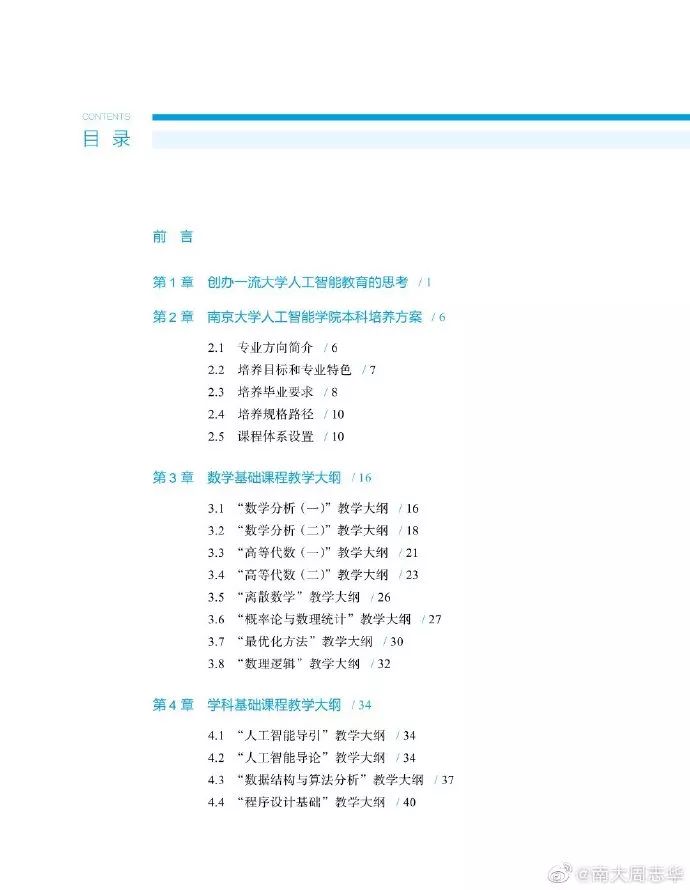 从周志华教授分享的《培养体系》内容介绍来看,该书是基于南京大学人工智能学院的主要学术带头人在AI人才培养方面的教学改革项目,对人工智能本科人才培养体系进行了梳理,相信可以对国内正在如火如荼开展的AI教育起到很好的示范和引导作用。
