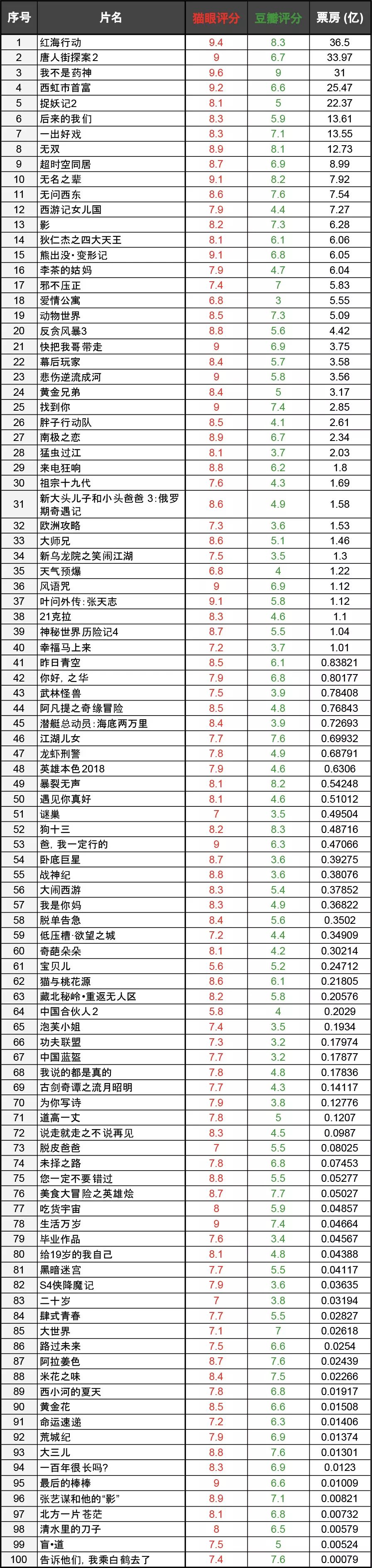 所以,我选用了「一起拍电影」评出的 2018 年度评分最高的 100 部院线电影,并按照票房做了排序,比较了两个平台不同的评分。