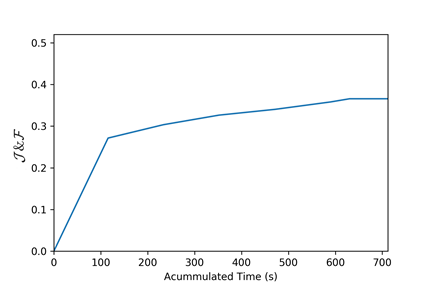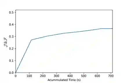 交互式视频物体分割不是一个单一算法,而且多种算法有机融合的解决方案,包括交互式图像物体分割、半监督视频物体分割、交互式视频物体区域传递算法等。其主要评估方法为 Davis Challenge on Video Object Segmentation 中提出的 Jaccard&F-measurement@60s (简称 J&F@60s )和 Area Under Curve(简称 AUC)。Davis竞赛提出限定8次用户交互,建立准确度随时间的变化曲线图,曲线下方区域的面积就是 AUC,t=60s 时刻曲线插值就是 J&F@60s。下图为一个 J&F 随时间变化曲线图。