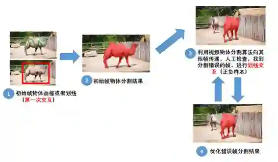 交互式视频物体分割是从去年开始兴起的、更贴近实用的视频物体分割方法。在交互式视频物体分割中,输入不是第一帧物体的 ground-truth,而是视频任意一帧中物体的用户交互信息。交互信息可以是物体 boundingbox、物体区域的划线(scribble)、外边缘的极值点等。