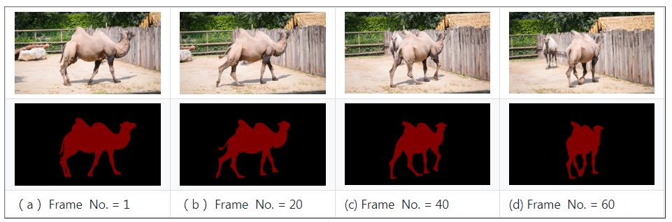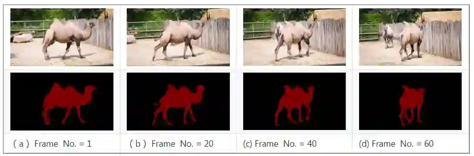 在图1中,第一行为序列的 RGB 图片,第二行为感兴趣物体区域。其中(a)为视频第一帧图像,骆驼区域是给定物体的 ground-truth。(b)(c)和 (d)是后续的第20、40和60帧,后续的图像只有 RGB 图片,需要算法去估计物体的区域。该示例的难点是: