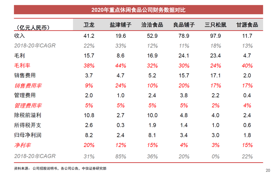 据中信证券报告,卫龙2020年的营收不过41.2亿,但净利润达到8.2亿,净利率20%;作为对比,三只松鼠2020年营收97.9亿,净利润3.0亿,净利率3%。也就是说卫龙食品的营收只有良品铺子、三只松鼠的一半,但是净利润比这两家加起来都多。