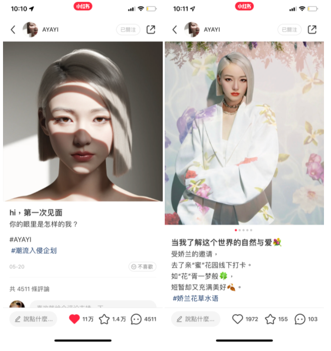 AYAYI 亮相小红书的首发帖阅读量近300 万,一夜涨粉近4万。这第一张图片至今已经收获了11万赞和1.4万收藏。