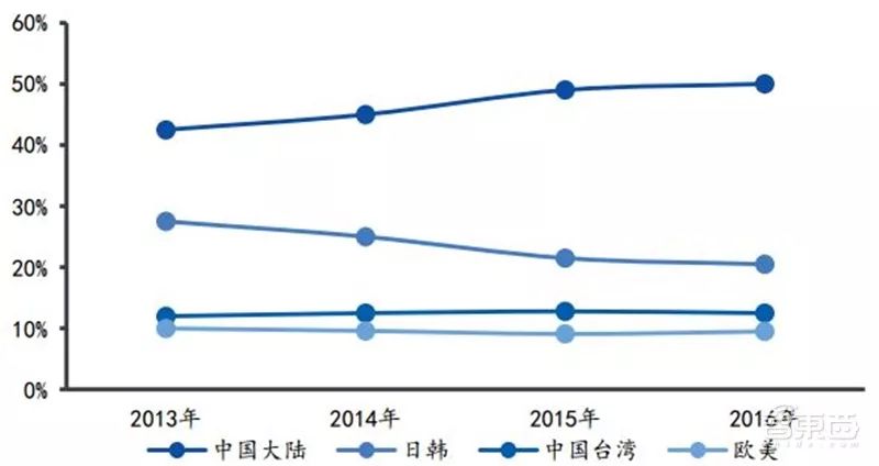 过去十年,液晶面板产能向韩国、中国台湾和大陆三地集中。尤其在产品价格不断下降,全球 TFT-LCD 显示面板需求增速放缓的背景下,国内液晶面板产业受益于产能转移发展速度高于全球水平。