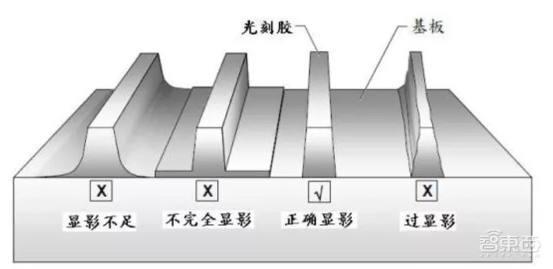 曝光完成之后为显影和坚膜,显影即将在曝光过程中形成的隐性图形显示为光刻胶在与不在的显性图形,光刻胶层中的图形就可以作为下一步加工的膜版。 坚膜即通过高温除去光刻胶中剩余的溶剂,增强光刻胶对硅片表面的附着力,同时提高光刻胶在随后刻蚀和离子注入过程中的抗蚀性能力。