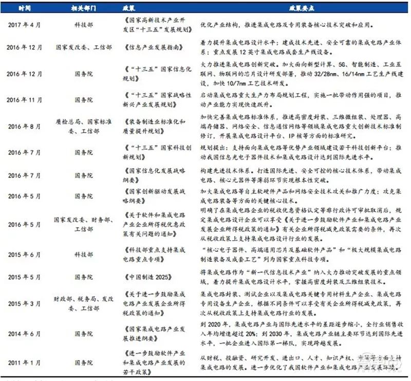 自 2000 年以来,我国出台了多项政策支持半导体行业发展。 2011 年,我国在2000 年《鼓励软件产业和集成电路产业发展若干政策》的基础上,出台进一步鼓励政策,从财税、投融资、研发、进出口、人才、知识产权、进出口、市场等多角度给予政策支持。