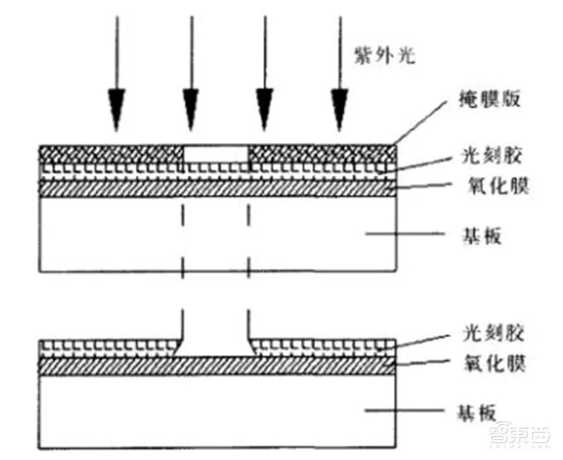 集成电路光刻工艺是指利用曝光和显影在光刻胶层上刻画几何图形结构,然后通过刻蚀工艺将光掩模上的图形转移到所在衬底(硅晶圆)上。基本原理是利用光刻胶感光后因光化学反应而形成耐蚀性的特点,将掩模板上的图形刻制到被加工表面上。