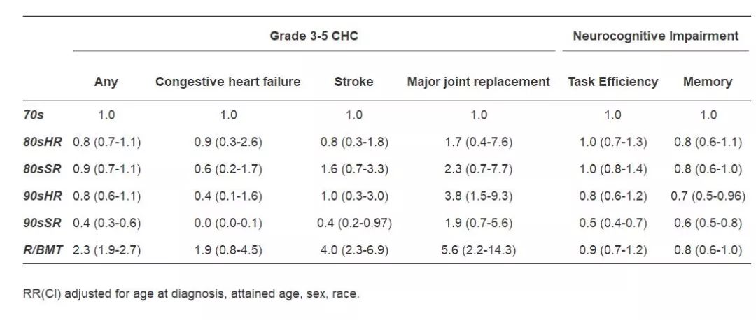 在6148名生存者中(中位年龄31.5岁),15年全因死亡率为5.8%(95%CI 5.3~6.2),HRM为1.5%(95%CI 1.2~1.7)。与70s组比较,90sSR和90sHR组的HRM更低(RR 0.1, 95%CI 0.0~0.3; RR 0.2, 95%CI 0.1~0.7),与美国人群相似(SMR; 95%CI: 90sSR 1.1, 0.6~1.9;90sHR 1.9, 0.8~3.7)。20年SN的累积发生率为3.5%(95%CI 3.1~3.9)。与70s组比较,90sSR发生良性脑膜瘤(RR 0.1, 95%CI 0.0~0.3),SMN(RR 0.3, 95%CI 0.1~0.6)的风险更低,与美国人群比较,风险没有绝对增加。90sSR发生CHC的风险较低。