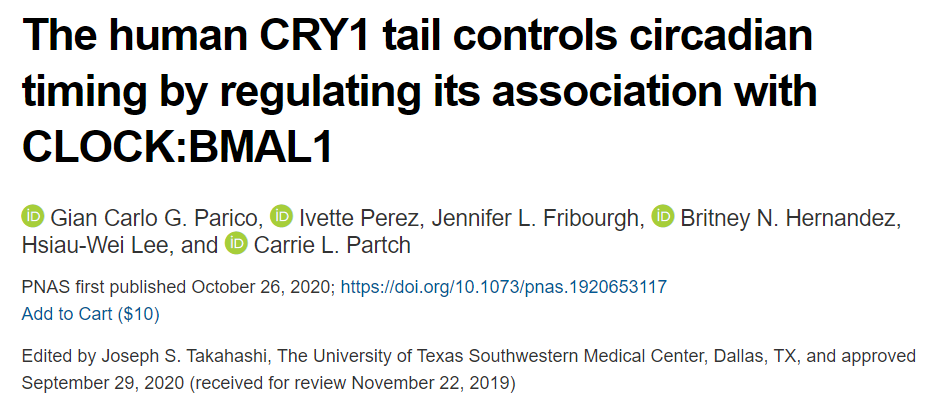 相关工作以“The human CRY1 tail controls circadian timing by regulating its association with CLOCK:BMAL1”为题,于 10 月 26 日发表在《美国国家科学院院刊》(Proceedings of The National Academy of Sciences,PNAS)上。 (来源:PNAS) 论文作者之一、加州大学教授凯丽·帕奇(Carrie Partch)表示,“这种基因突变对人们的睡眠模式有显著的影响。因此,在生物钟中找出一种具体机制,将这种蛋白质的生化反应与人类睡眠行为控制联系起来,是一个值得探索的方向。” 这种突变十分普遍 多年来,帕奇一直在研究时钟蛋白(clock proteins)的分子结构和相互作用。在今年早些时候发表的一项研究中,她的实验室揭示了某些突变如何通过影响分子开关机制来缩短时钟时间,从而使一些人极端喜欢早起的机制。