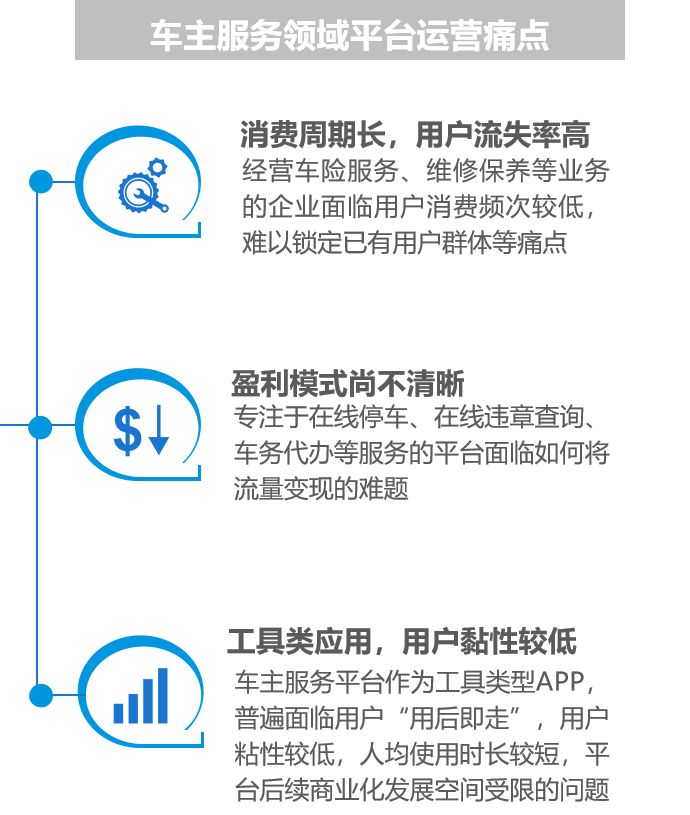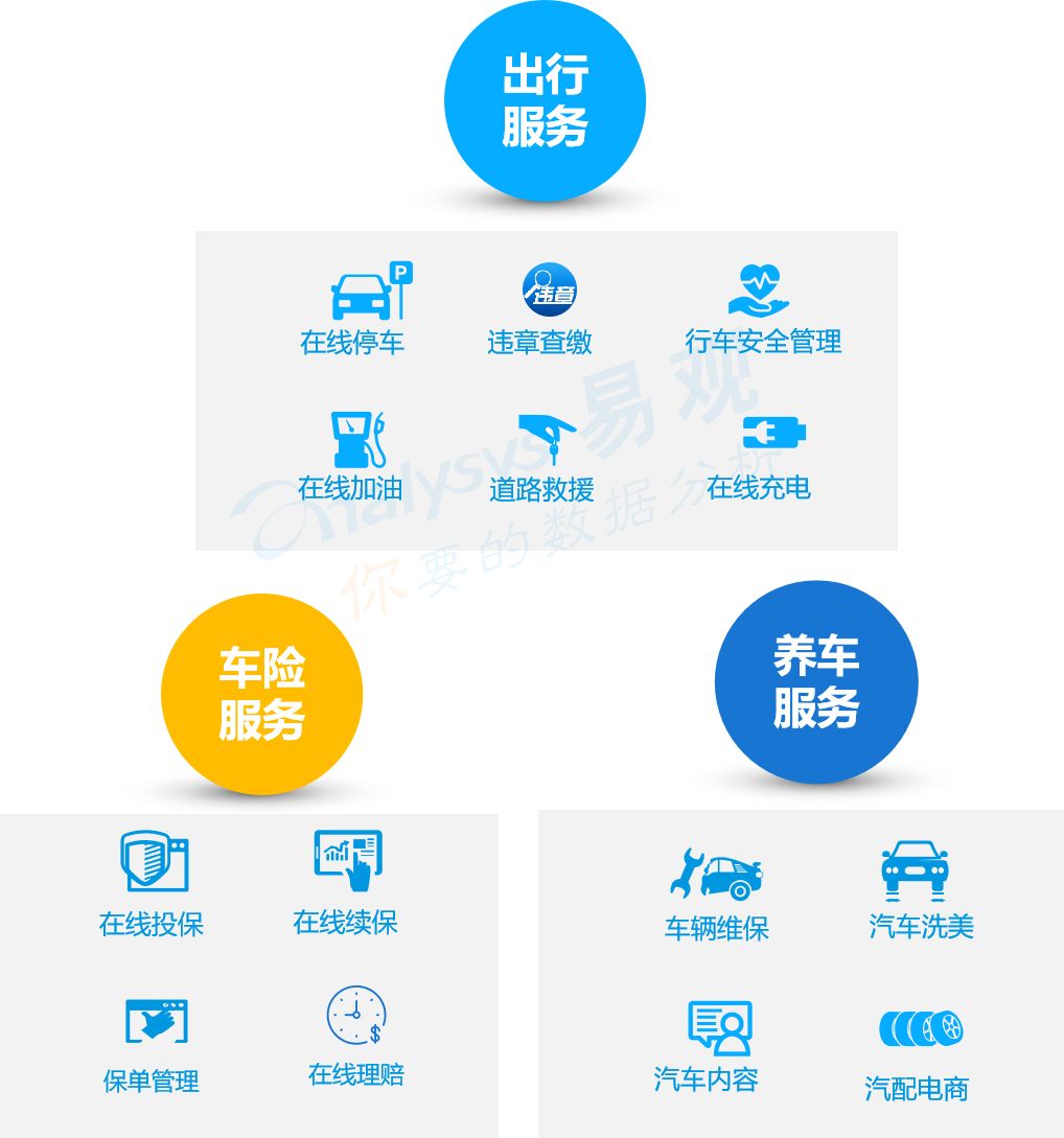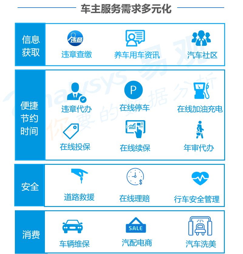 近年来中国在线车主服务市场涌现大量成熟的互联网企业,他们通过线上线下服务协同的方式,推动车主服务升级,带动行业服务效率提升。尤其是在用车出行、车辆维修保养、汽车金融、二手车交易等领域。