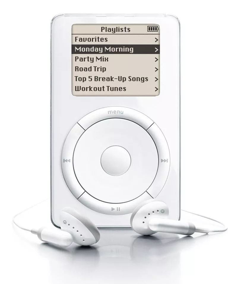 2001 年的 iPod 是乔纳森的另一个杰作,机身的滚轮成了这个产品的标志性特色。