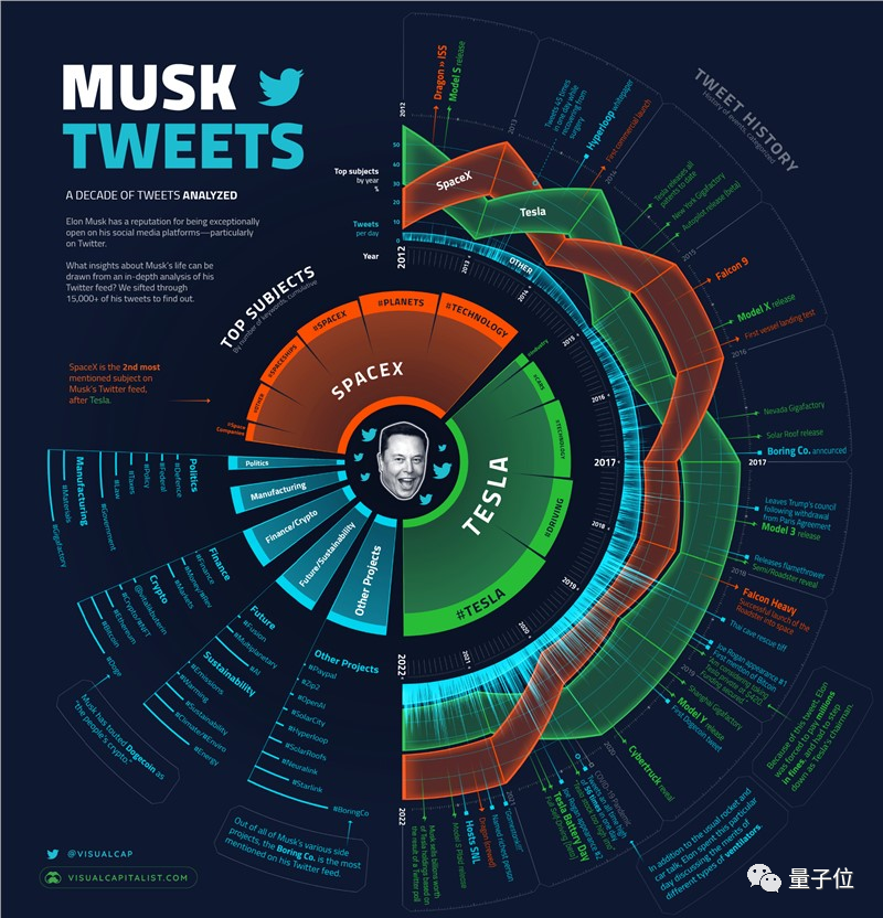 国外数据分析网站Visual Capitalist,就对马斯克近10年的推文做过分析。