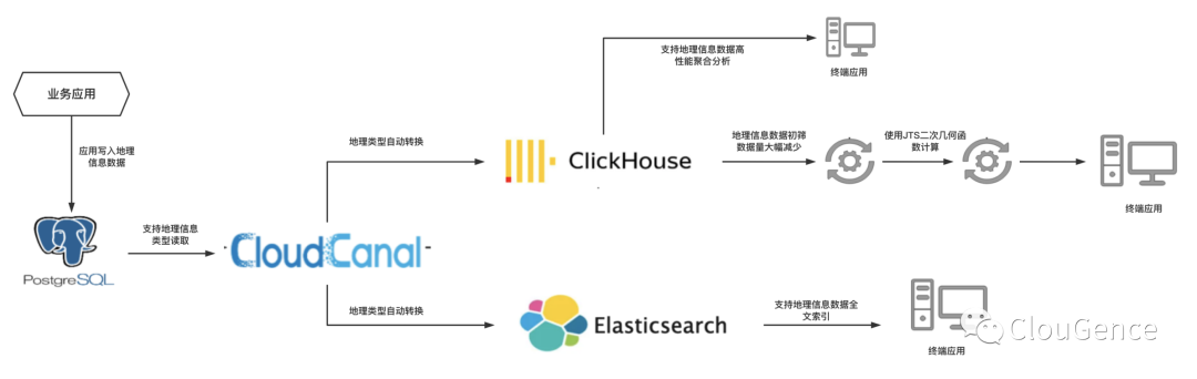 通过 CloudCanal 数据互通,采用如下现代化的数据栈,轻松整合了 ClickHouse 强大的分析能力和 ElasticSearch 的强大全文索引能力来处理地理信息数据,大大提升了地理信息数据处理的效率。