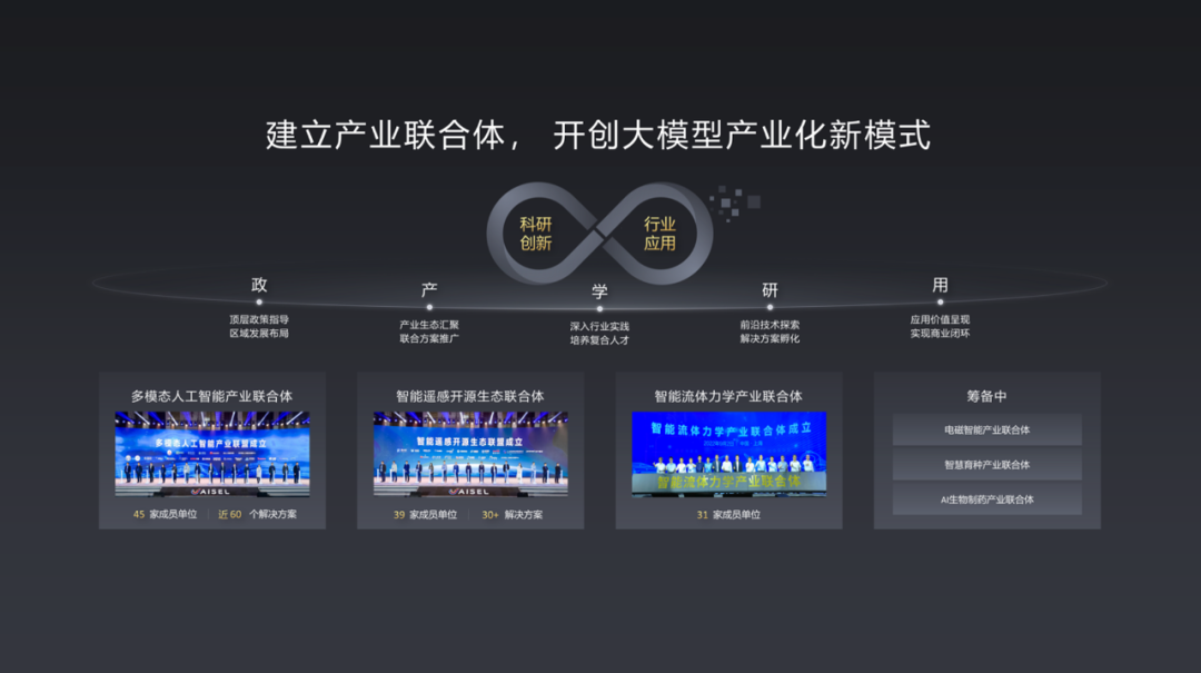 开创了一条大模型产业化落地的新模式,即围绕某个领域的大模型成立产学研用的产业联合体,打通科研创新到产业落地整个流程