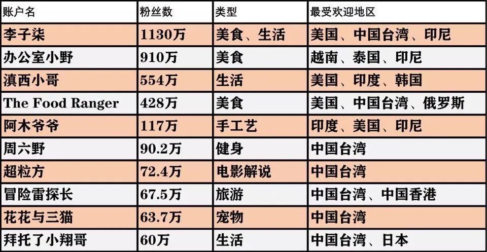 另外,排名靠前的创作者中,美食内容占多数,因为美食也是最直接、最能跨国界的内容类别。