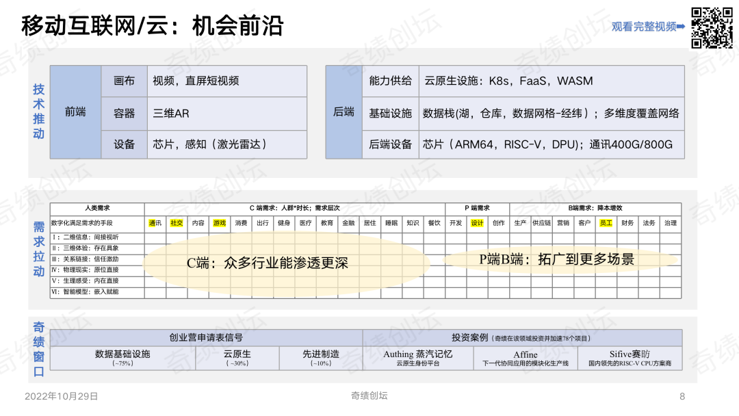 有了刚才针对数字化结构的分析之后,那我们接下来看新一代的生产力的宏观机会板块概览。在奇绩创坛,我们通常用这一页的宏观机会板块看创业创新机会。
