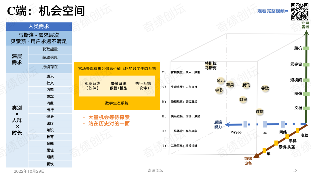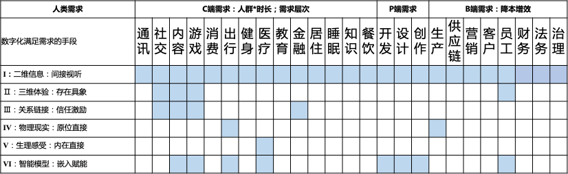 在上面的图中,我们用蓝色标注了技术满足需求的进展,比如二维信息,通过电脑和手机,基本上所有的 C 端和大部分的 B 端都局部地满足了人的需求,元宇宙和 Web 3 才刚刚开始。